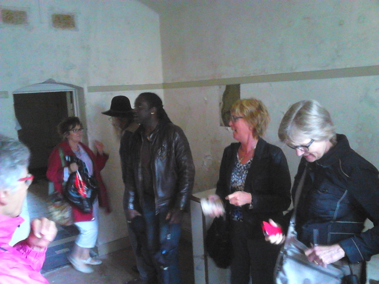 Momenteel zit er een Paintball Centrum in het gebouw waardoor het er een glibberige bedoening is geworden. Tussen het zaagsel en afval van de paintballs door hebben we de gangen, verblijfruimtes en cellen bekeken. Soms zat daar onverwacht veel accoustiek in, en dus werd er spontaan een lied ingezet! Hilariteit alom; wat een herrie!